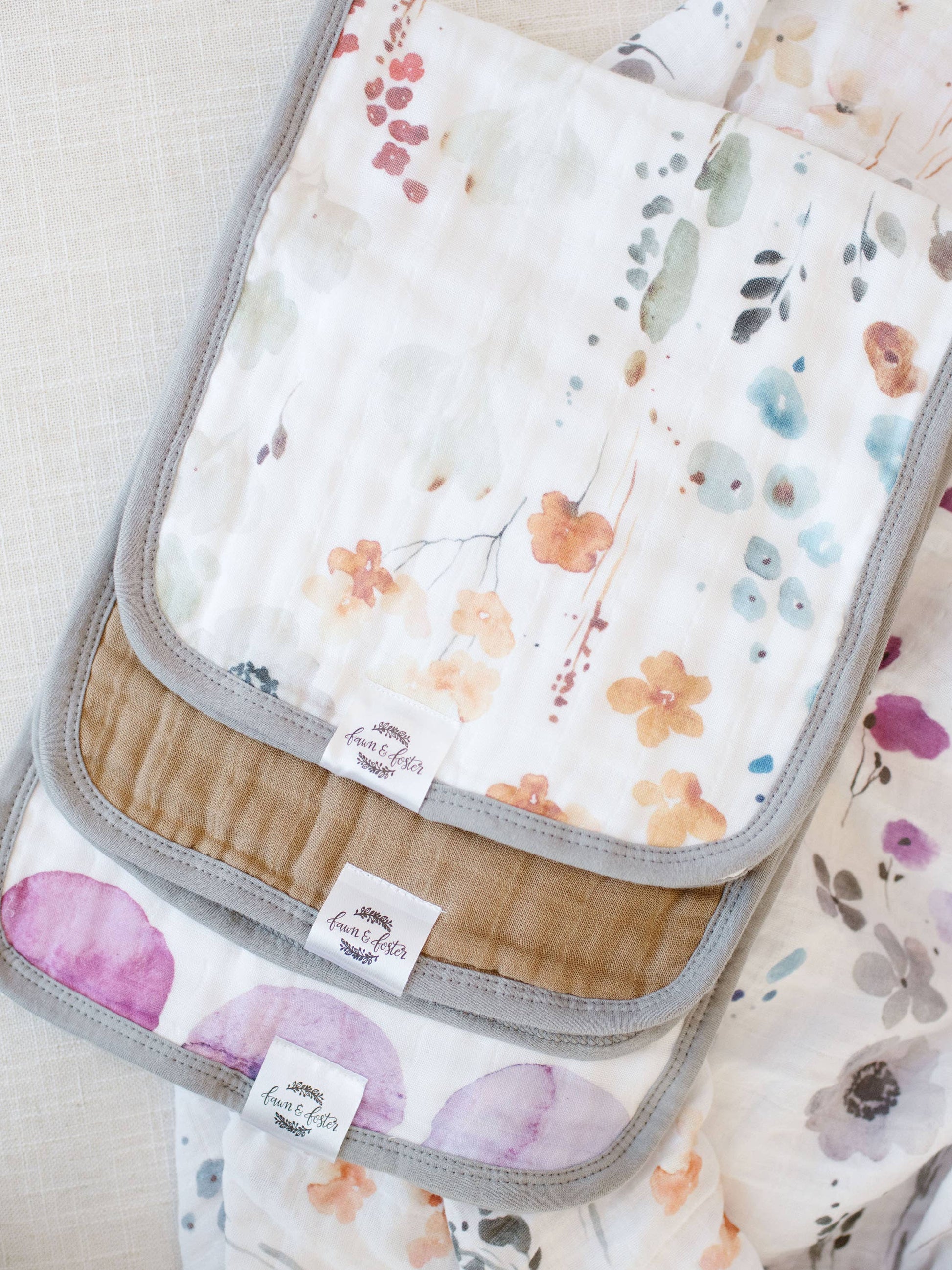 The Violet Collection features delicate watercolor flowers in soft shades of blue, violet, and orange on ultra-soft organic fabric. Designed for sweet snuggles, this floral collection brings a touch of whimsy and elegance, perfect for adding charm to any baby’s nursery. SUPER SOFT: Four layers of our organic muslin gauze cotton in beautiful watercolor prints🌿 PERFECT for keeping you and baby dry during feedings. Doubles nicely as a little lovey blankie❤ SIZE: Extra large, 21” x 10”✨ CONTENTS: Three (3) pack. BEAUTIFUL GIFT: All Fawn & Foster products arrive in gorgeous, minimal packaging. Our mission of donating a portion of proceeds to helping foster children & other children in-need is stated on every package, so you feel confident in your purchase whether for yourself or as a gift. Thank you for your love and support of our mission to help these sweet children 🎁